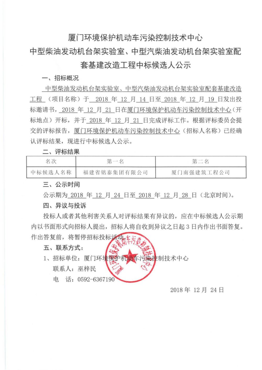 廈門環(huán)境保護(hù)機(jī)動車污染控制技術(shù)中心中型柴油發(fā)動機(jī)臺架實(shí)驗(yàn)室、中型汽柴油發(fā)動機(jī)臺架實(shí)驗(yàn)室配套基建改造工程中標(biāo)候選人公示
